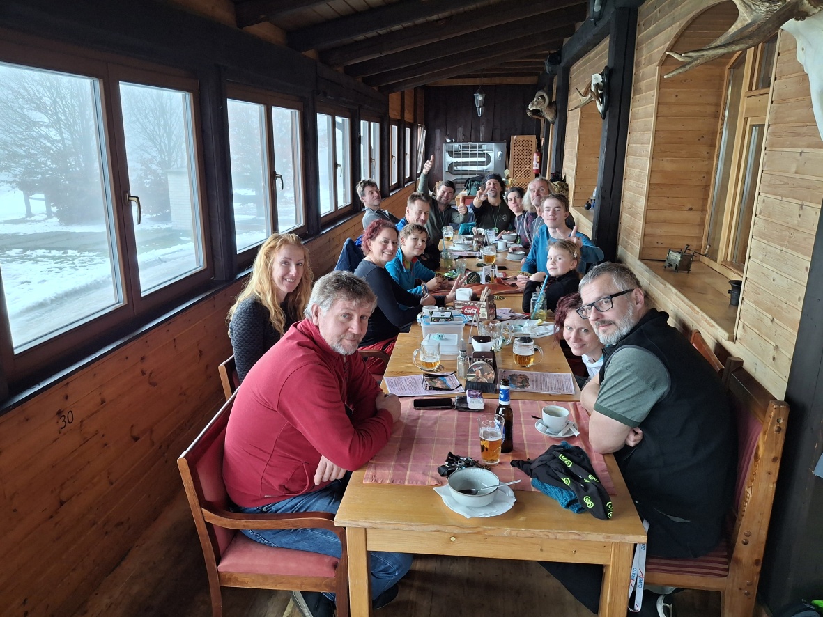 V hospodě už na nás čeká Michal s Adélkou a dalšími kamarády. Dáváme si něco k jídlu a pití a užíváme si pohodu v kryté terase s výhledem do údolí, které dnes ale kryje mlha.