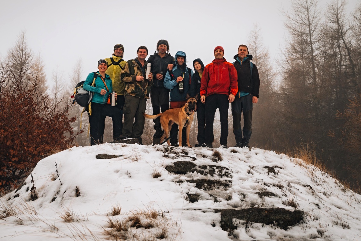 Popíjíme čaj z termosek, k tomu i něco ostřejšího z placatice, Sandy rozdává slaninu, prostě taková vrcholová pohoda. Za chvíli už nám ale začíná být zima, tak se raději rozcházíme. Já a Buchtík míříme zpět dolů k autům, ostatní pokračují dál na Lesnou do hospody, kde se později opět setkáváme.
