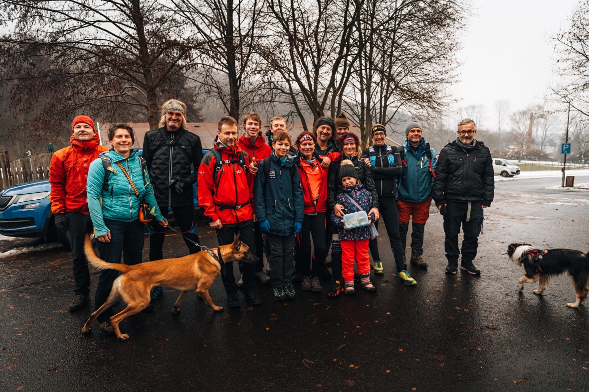 Před desátou hodinou už se v Peci u koupaliště scházejí první účastníci, já přijíždím se Sandym o chvíli později. Postupně přijíždějí i další účastníci, takže nakonec se nás tam schází 15 a dva psi. Teplota je těsně nad nulou a lehce mrholí. Jak říkal kdysi Grossmann, ideální počasí, není horko a nepráší se. Všichni se řadíme na společné startovní foto, které dělá Buchtík ze stativu svojí zrcadlovkou na samospoušť. Michal odjíždí s Adélkou autem nahoru na Lesnou, šest běžců, sedm pěšáků a dva psi vyráží na trať s převýšením 528 m k vrcholu Jedláku ve výšce 851 m nad mořem.