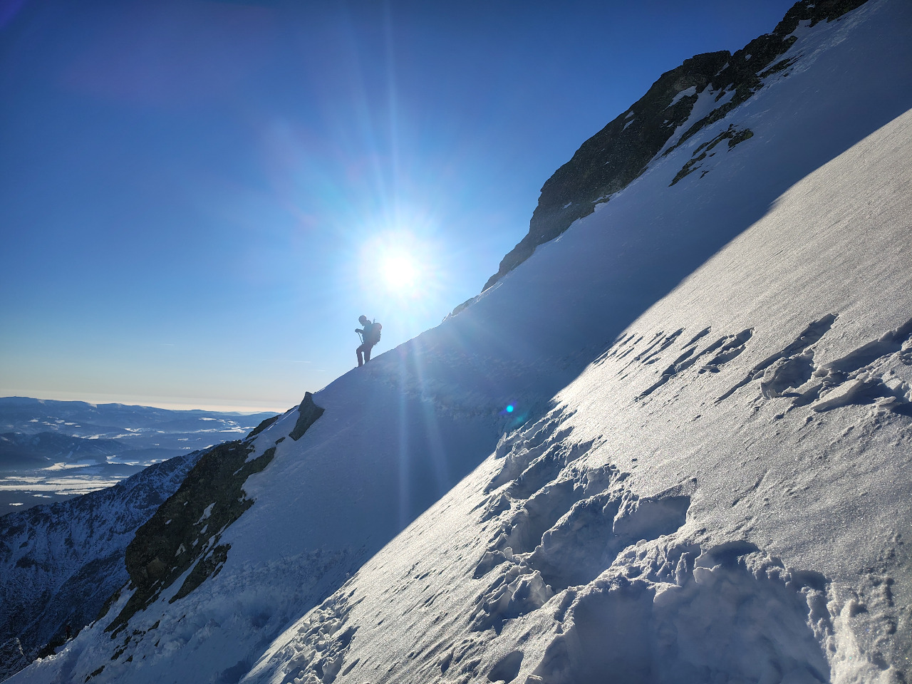 Já přelejzal zbytečně pár šutrů a Karlos si našel krásný plácek o několika centimetrech čtverečních, kde se rozhodl předvést svých pár baletních kousků při nasazování sedáku. Nikdo nevíme proč, ale tak to v horách prostě bývá. Čekal nás ještě traverz s několika lavinovými poli, která krásně držela a naštěstí i při cestě zpět.