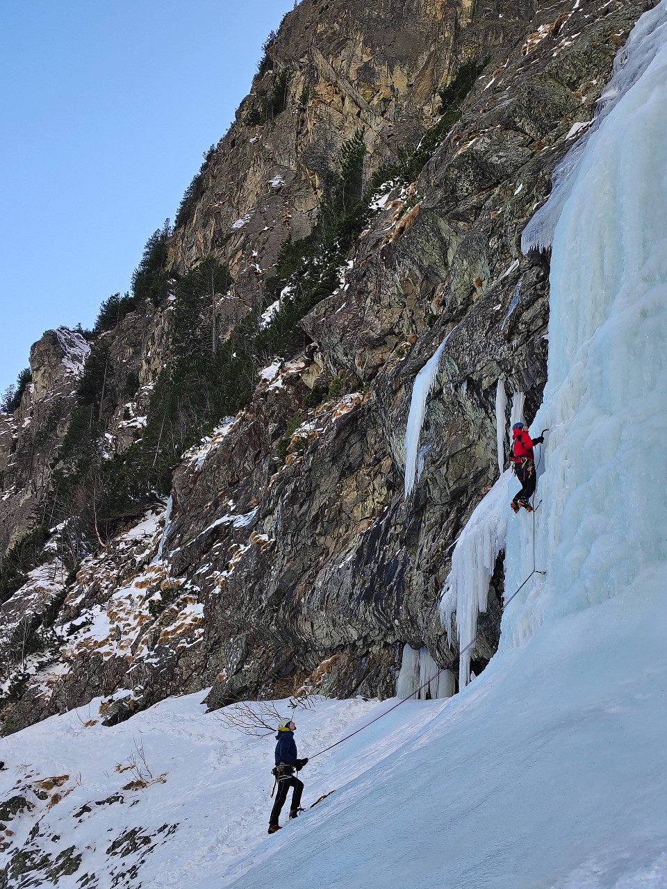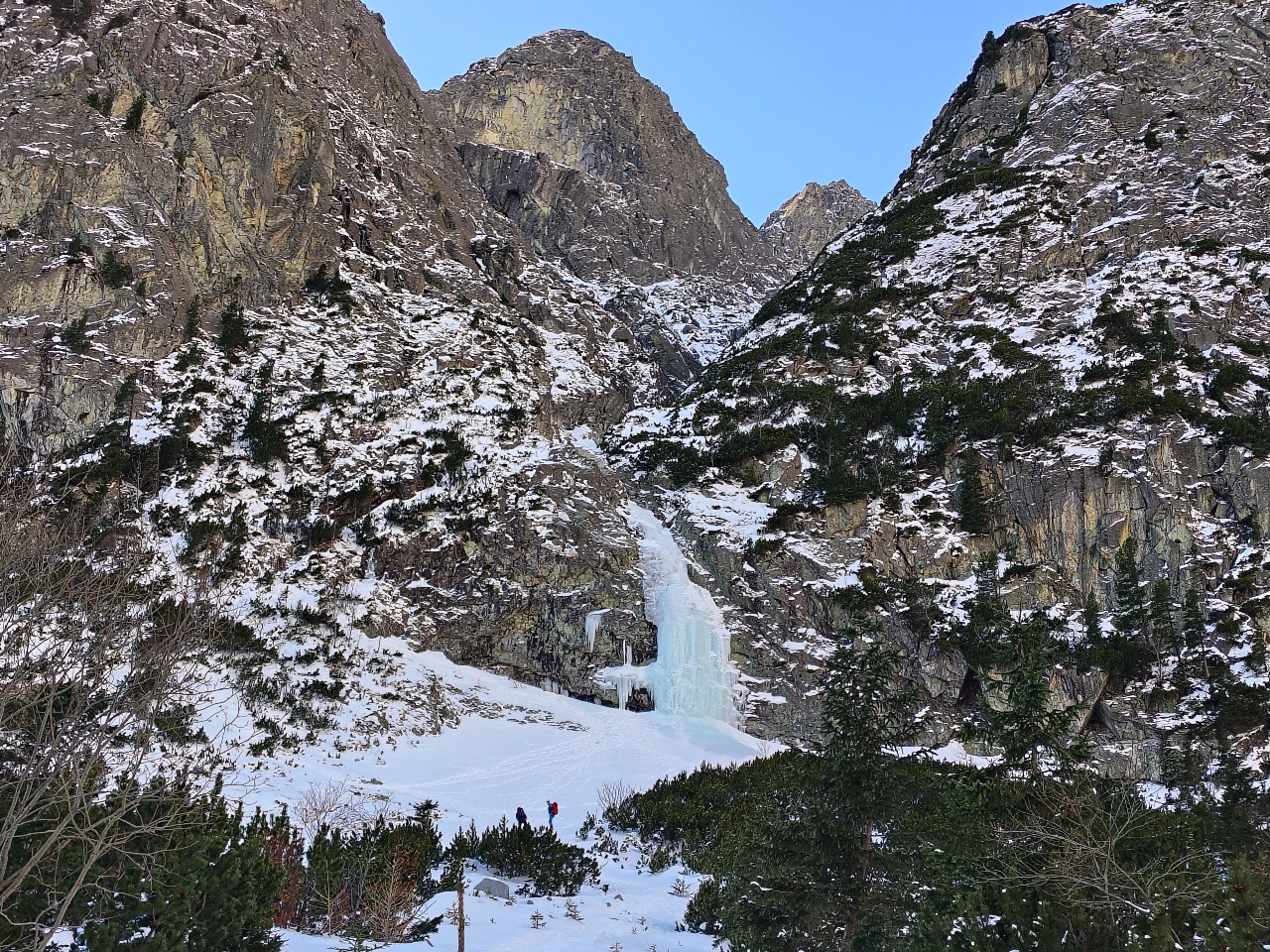 Karlos si vybral levou, relativně suchou část ledopádu, ale taky pěkně těžkou. Po pěti šroubech v kolmici a pár odsedech jsem mu řekl, ať se na to vysere. Sám jsem rychle na druhém (na rybu) poznal, co je tam za úskalí a jak to sakra tahá. Následně se ještě vystřídali kluci a začali jsem balit. Nebyl prostě čas na ledech zdomácnět. Na sestupu si Karlos hraje s myšlenkou na skialpy a navrhuje dojít alespoň k Bráně pod Zbojničku. Sice nevím přesně, kde to je, ale po pár krocích do mírného kopečka: „Se ty vole omlouvám, to nedám“. Stehna, stejně jako celé tělo je po včerejšku vyždímaný a žádá, s červeným vykřičníkem, regeneraci.