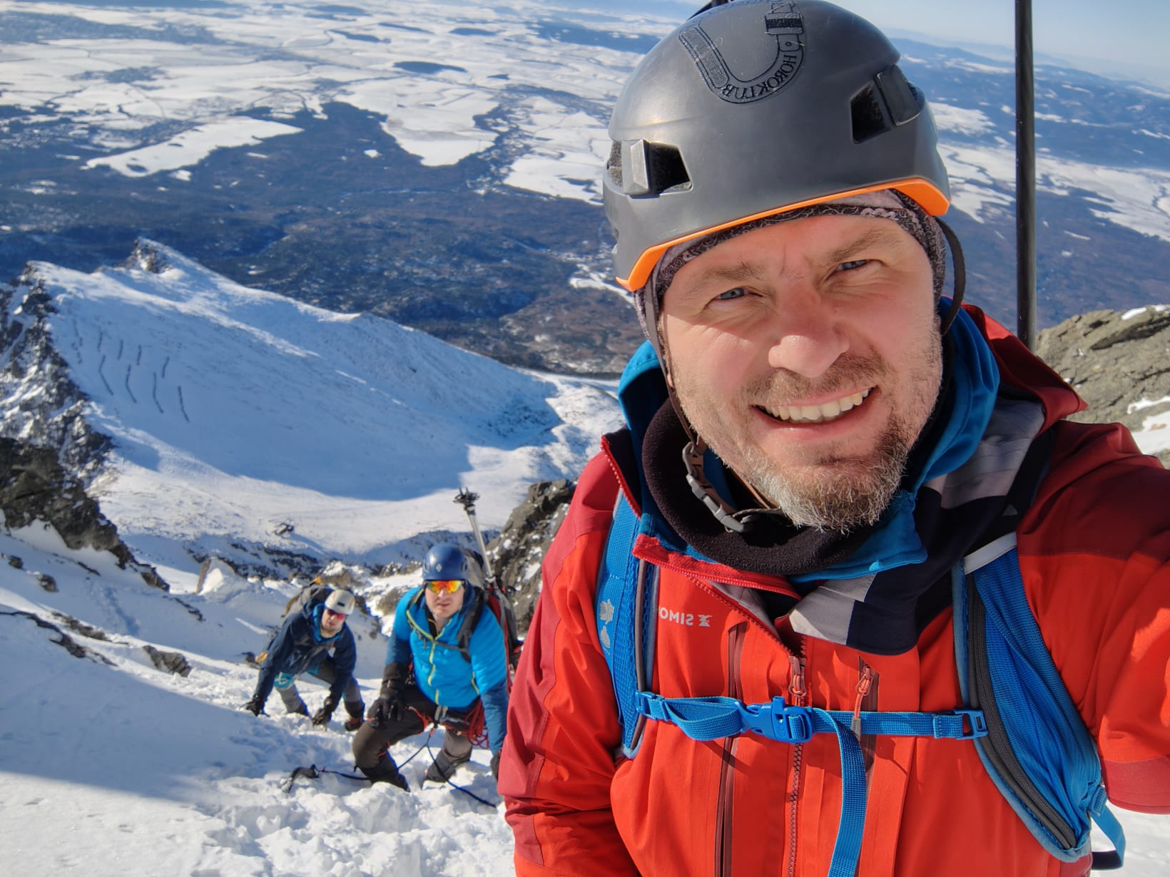 A jsme pod onou vrcholovou hlavou. Kluci došli s hůlkama až sem. Teď jsou na řadě cepíny. Jdeme starou cestou, kde jsou nějaké kramle, oka na dojištění/slanění a pár řetězů, co se jim nepodařilo schovat se pod sněhem. Pár metrů pod vrcholem v tom nejblbějším zaledněném místě potkáme skupinu sestupujících Poláků. První je jen v nesmekách, ostatní mají alespoň turistické mačky. Každý jeden turistický cepín a jeden dokonce helmu – vyvrhel. Sestupují s rozvážností lenochoda. Nedivím se a jdeme jim stranou. Dolů s nimi při případném pádu nechceme (zde jen doplním, že Poláci vedou ve statistice úmrtnosti ve Vysokých Tatrách). Vzhledem k počtu a rychlosti skupiny, Blahouš, náš lingvista, domluví, že bude lepší, když nás pustí nahoru, a pak si tu budou dělat co chtějí. „Je to nenapadne, to bysme tady strávili hodinu“ a přidá pár sprostých slov. Můžu jenom souhlasně kývat. Po pár krocích začínají výhledy. Nejdříve na vrchol, kde se promenádují turisti z červených krabiček, a pak do okolních dolin. Tohle počasí je opravdu za odměnu. Blahouš nadhodil, že by se svezl lanovkou dolů. Po zralé úvaze jsem si řekl, že by to nebyl úplně blbej nápad. S Karlosem jsme zase přemýšleli o kafičku, ale nejdřív jsme se šli porozhlédnout po okolí. Blahouš chvíli přebaloval cajky, a pak zmizel v budově. Za chvíli se objevil a prý mu číšník na dotaz, kdy jede nějaká lanovka dolu, kterou by se mohl svézt, odpověděl, že zítra. Dost možná si robí prdel z horolezců, co si nahoru vylezou, a pak si tu prdel chtějí svézt. Nicméně to znamenalo, že vyrážíme v podstatě okamžitě, ať slunko neroztopí sníh na lavinových svazích a dalších obtížných místech. Až se z toho Blahouš ani nepodíval po kraji a nedošlo ani na vrcholové foto.