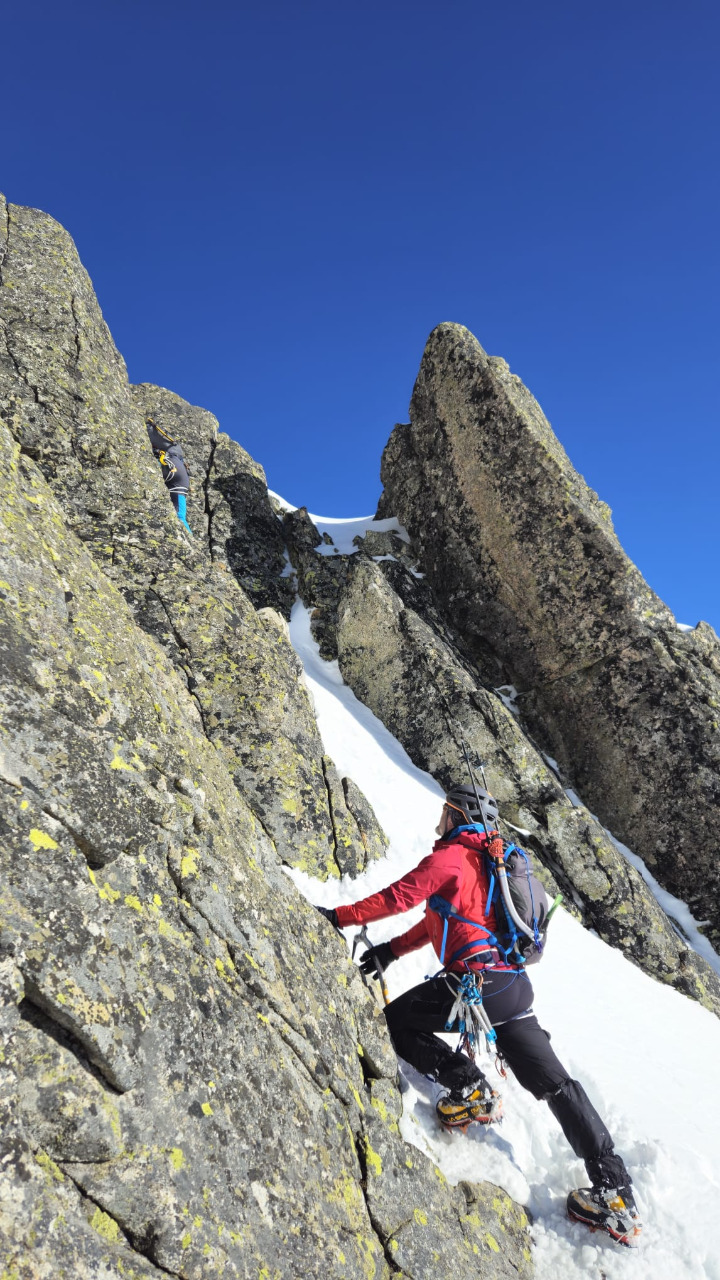 Je pondělí a nikde nikdo, což se nám moc líbilo. Na chvilku naše radost opadla, když se začala přibližovat čtyřčlenná skupinka, ale jen na chvilku. Jak jsme zjistili, šlo o párek kurzistů, co všechno zběsile natáčeli, pomocníka a horského vůdce Pala, kterého jak jsem si později vzpomněl, znám z Brádlerových bud, když jsme měli s horoklubem zimní metodiku. Jak je ten svět malej. Byla s nima legrace a Palo nám dotáhl délku, když došlo magi. Sám sebe i zbytek své skupiny navezl, sice do lehčí délky, ale pod brutální sprchu a jak si dal bundu přes rukavice, měl vodu až v trenkách (zde se rozepisuju, jelikož mi to přijde jako dobrá poučka a jak sám pravil, člověk se učí celý život).